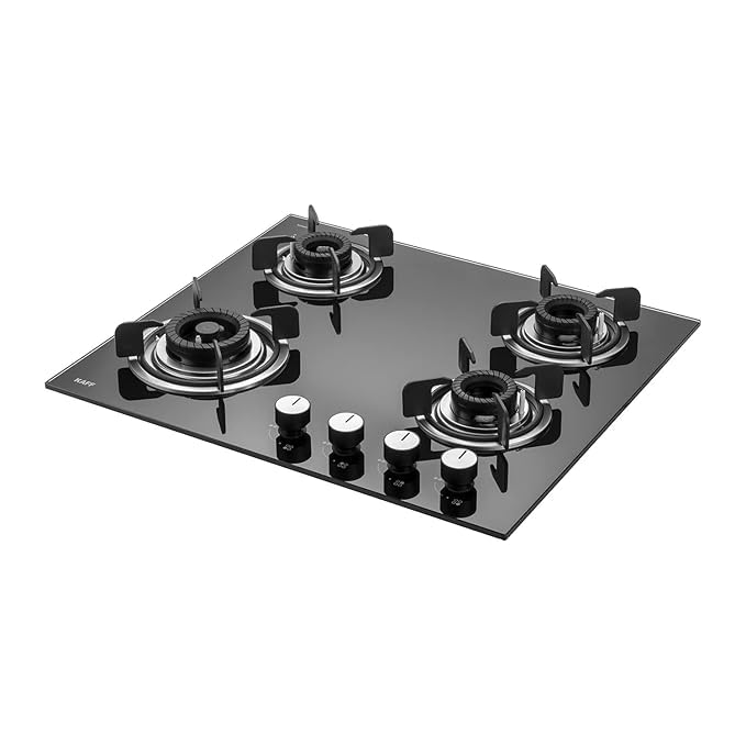 KAFF CRISTA CRH 604 Built-in Hob/Hobtop 4 Burners, Auto Electric Ignition Glass Top, 60 CM, Black Coated Tornado Style Burners, SS Drip Tray, 8 MM Thick Toughened Glass (Black)